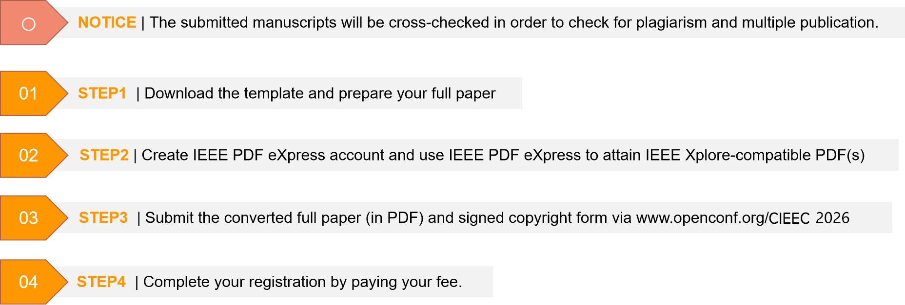 1. Authors must submit their full paper and copyright form through the CIEEC 2026 Full Paper Submission System no later than Jan. 5,2026.